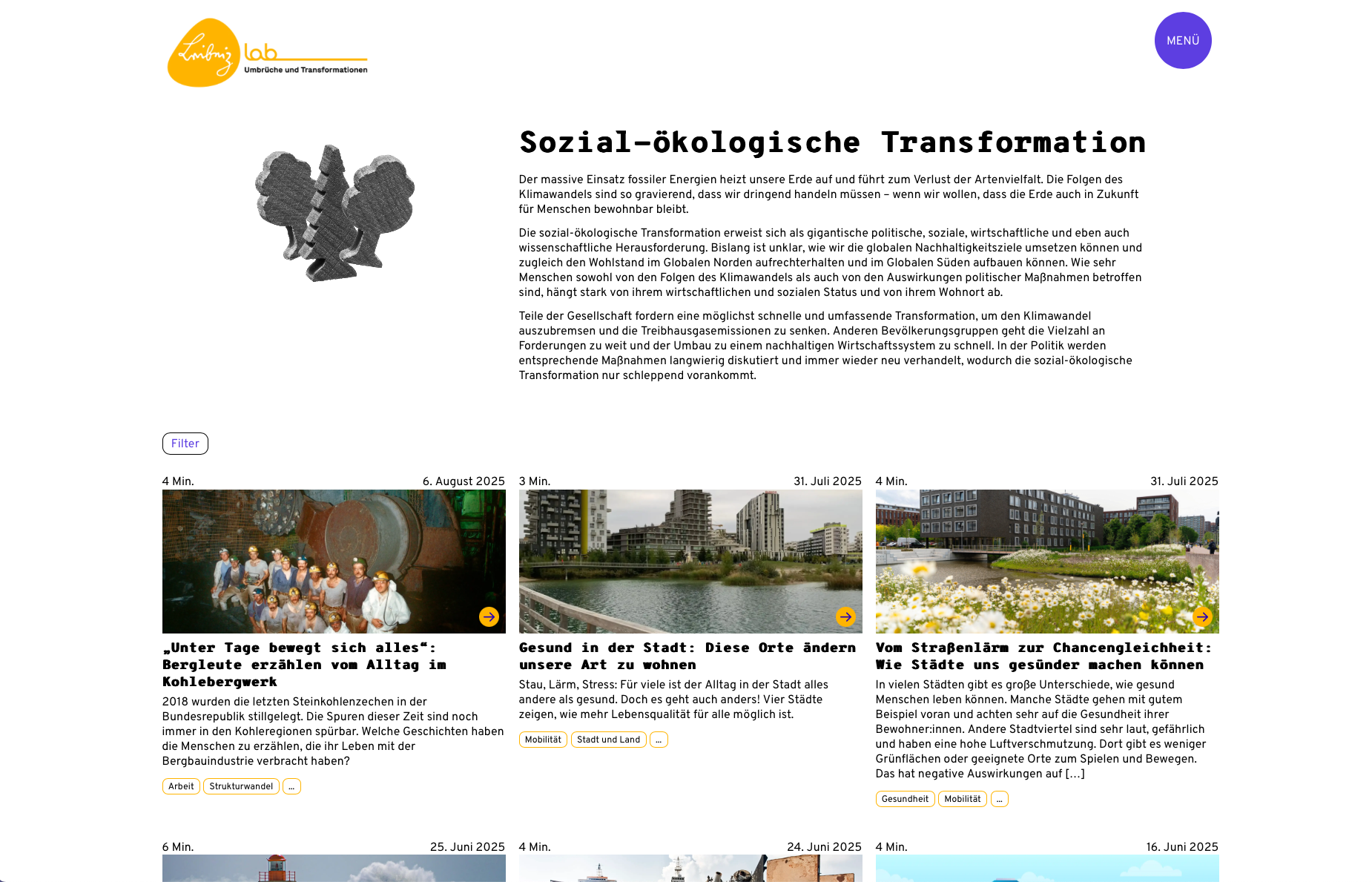 Das Leibniz-Lab "Umbrüche und Transformationen" analysiert die Forschung von 28 Leibniz-Instituten, um aus früheren Krisen und Umbrüchen für Gegenwart und Zukunft zu lernen. Dabei werden Transformationsprozesse aus verschiedenen Regionen und Zeiten verknüpft, um disruptive Momente sichtbar zu machen, die uns zu richtungsweisenden Entscheidungen für die Zukunft zwingen. Für das Lab haben wir eine Website entwickelt, die Forschung und Gesellschaft miteinander verbindet. Ziel war es, die komplexen Themen rund um Transformationen und Umbrüche verständlich und zugänglich zu präsentieren. Unsere Arbeit umfasste Konzeption, Design und technische Umsetzung einer klar strukturierten Plattform, die Forschungsergebnisse bündelt und unterschiedliche Perspektiven sichtbar macht. Zudem erstellten wir kleine Animationen, die bei Mouseover in Bewegung geraten.
