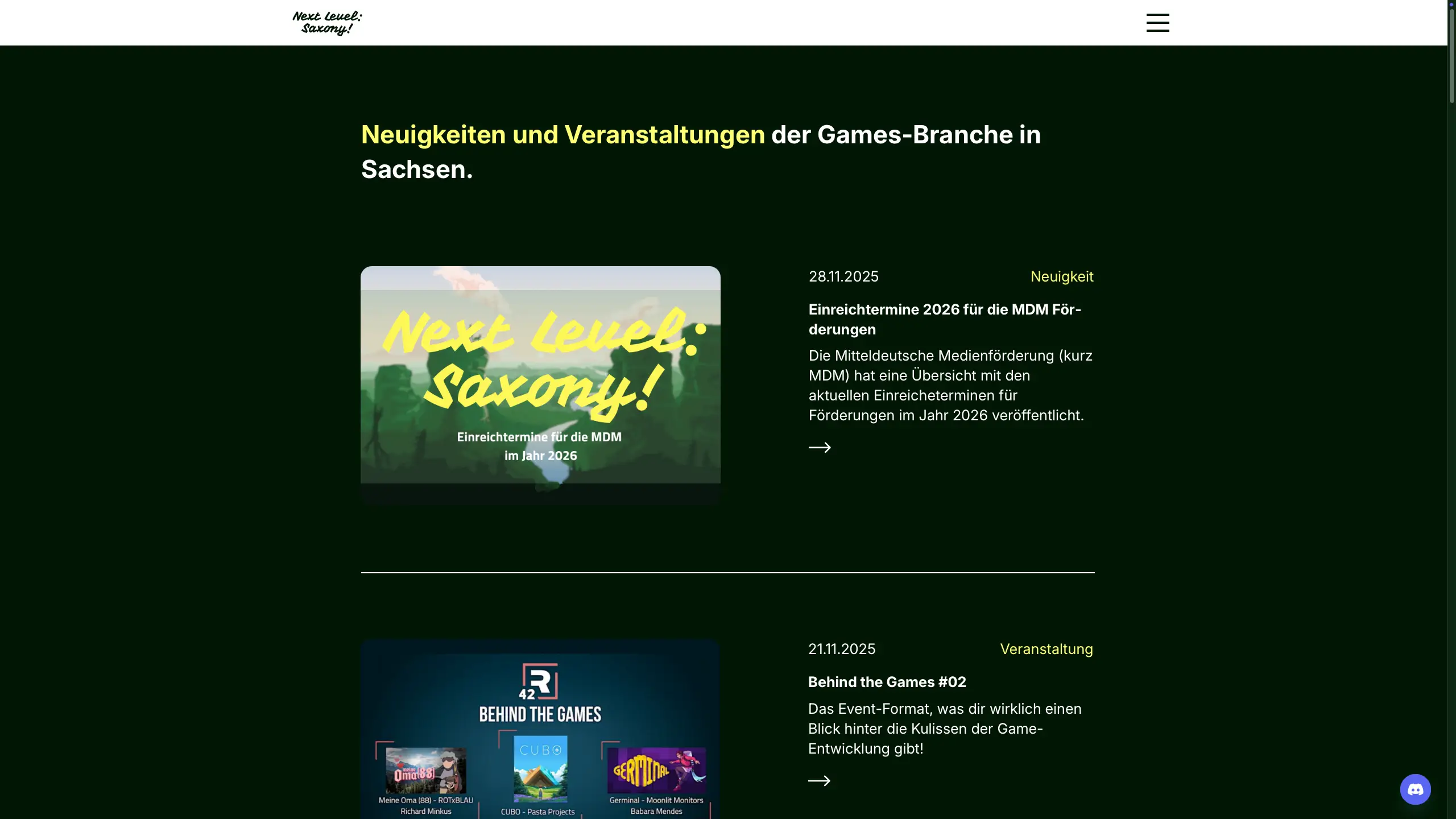 Die News-Seite präsentiert aktuelle Meldungen, Termine und Entwicklungen aus der sächsischen Games-Branche in einem klar strukturierten, modernen Layout. So bleiben Nutzer:innen über neue Förderprogramme, Events und relevante Branchennews stets auf dem Laufenden.